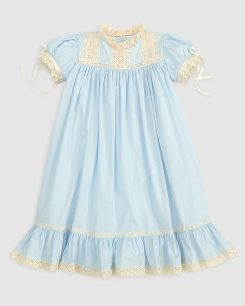 This Bristol Blue Heirloom Dress is exquisitely handcrafted with short puff elasticized sleeves, intricate lace and ribbon detailing, and classic buttons at the back neck.