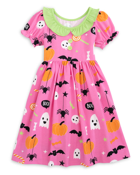 Boo! Pink Knit Halloween Print Swing Dress with Lime Green Ruffle Collar