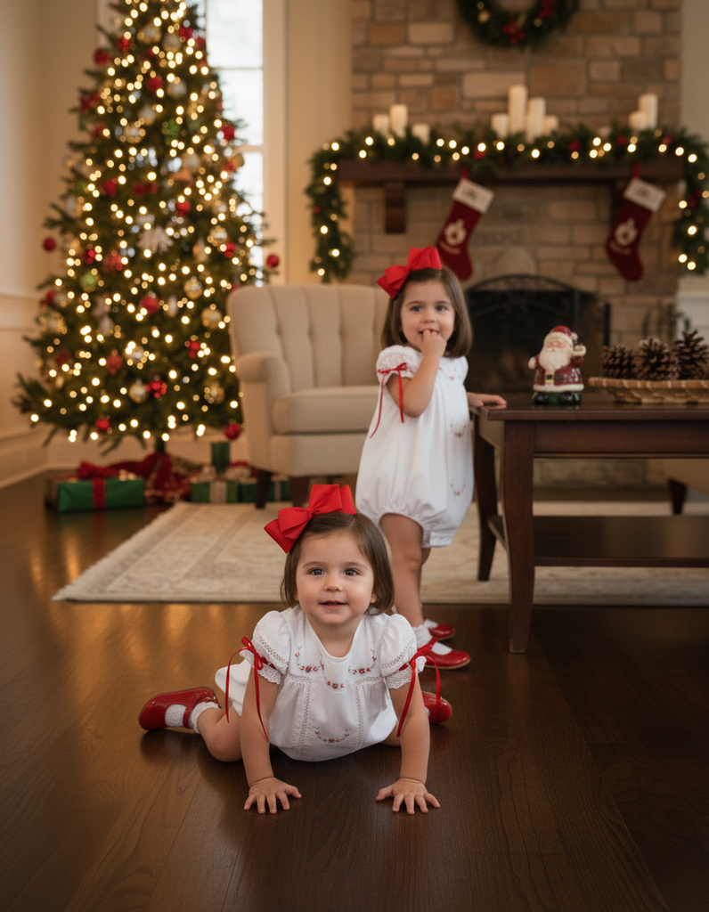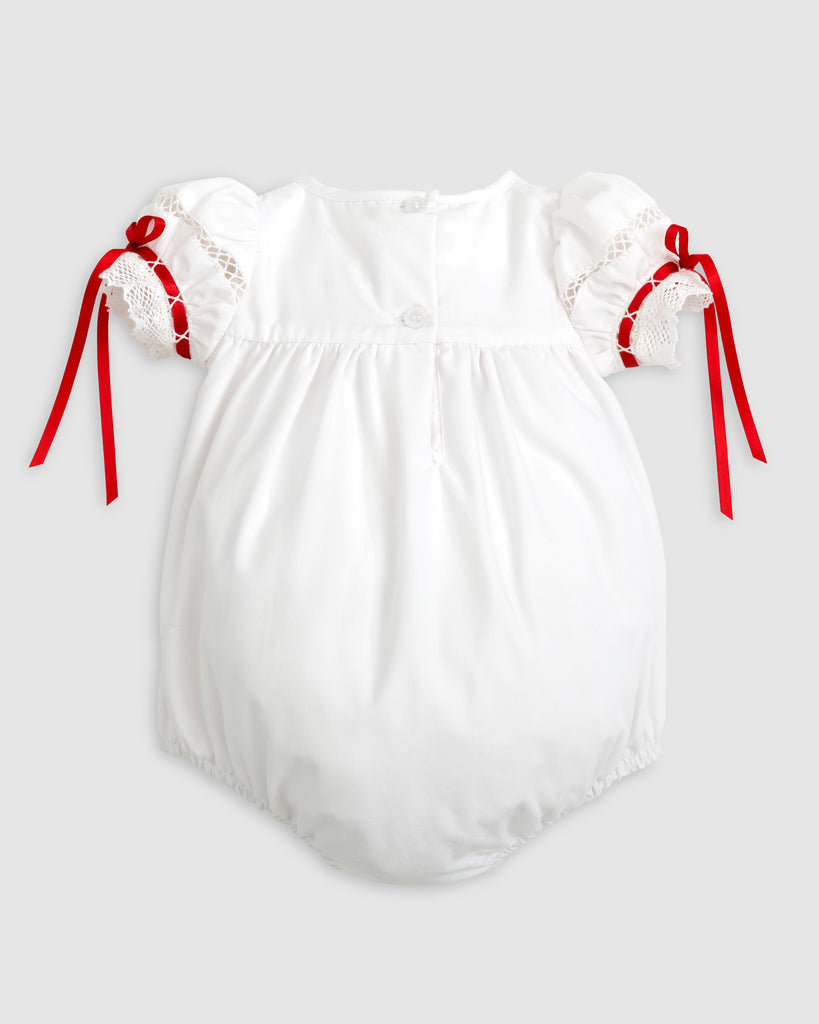 Crafted for infant girls, the Gilded Noel Holiday Heirloom Bubble features soft, white 100% cotton with delicate hand-embroidered crescent wreaths. Accented by elegant red satin ribbon and refined ladderwork crochet trims, this fully lined piece offers both comfort and timeless sophistication for special holiday occasions.