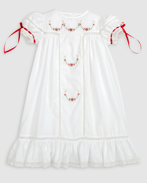 This elegant girls’ dress, crafted from 100% cotton, features exquisite hand-embroidered crescent floral wreaths that evoke timeless holiday charm. Accented with a red satin ribbon trim and delicate ladderwork crochet, it embodies refined heirloom quality, making it a perfect choice for Christmas portraits and special occasions. Includes lace trimmed slip.