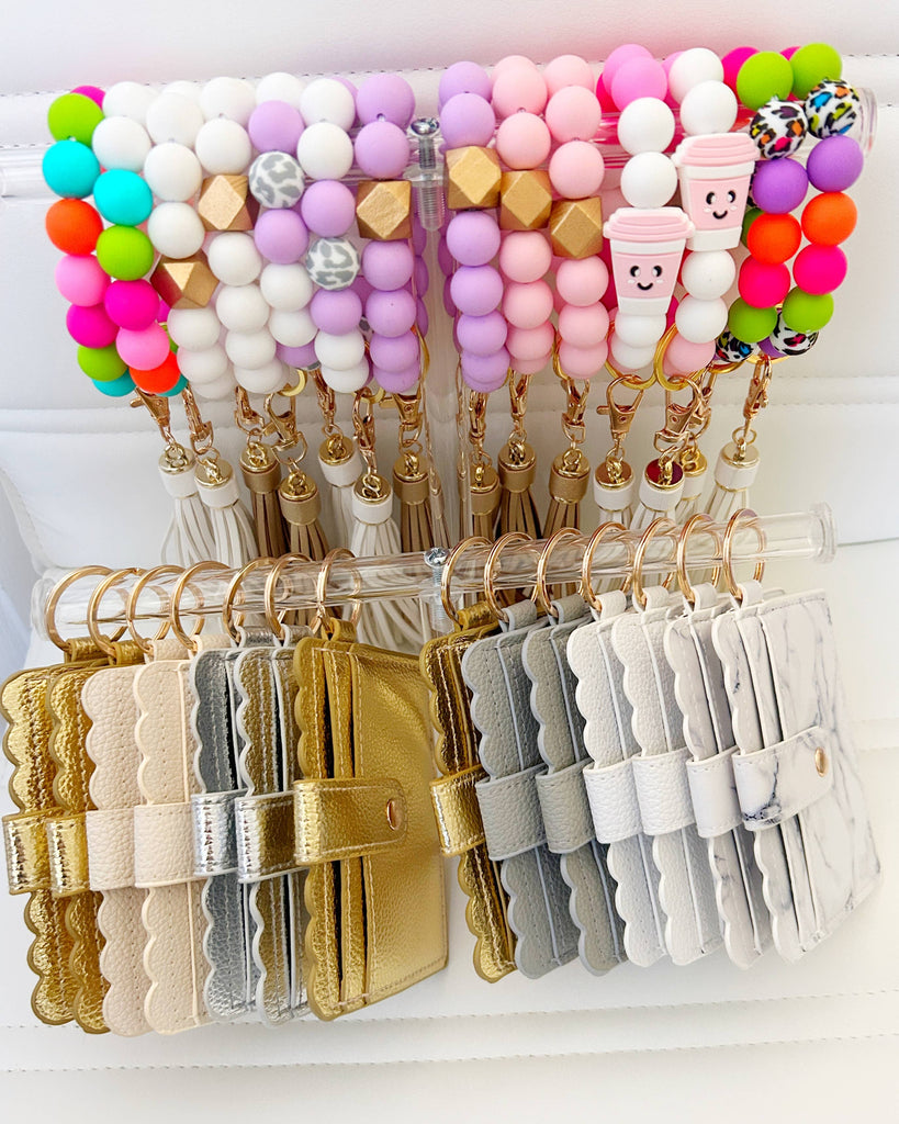 This wristband keyring is made with silicone beads, split ring, clasp, and leather tassel. The wristband keychain makes it easy for you to have your keys and wallet attached to your wristband, which easily slides onto your wrist!