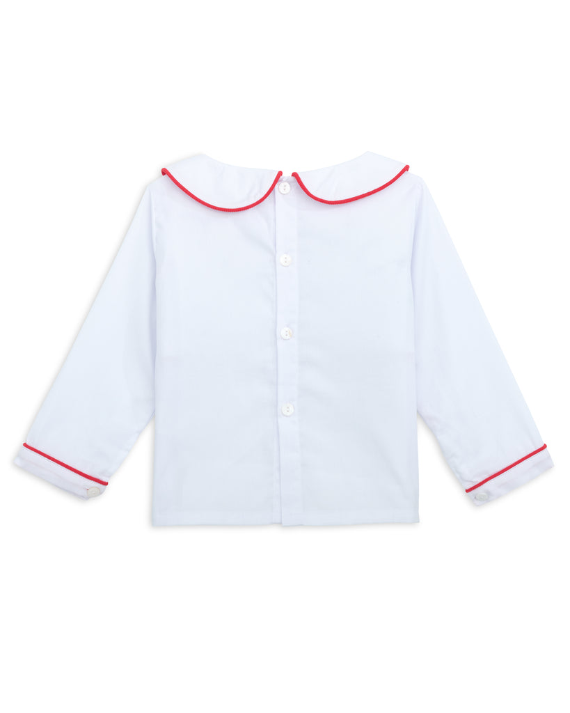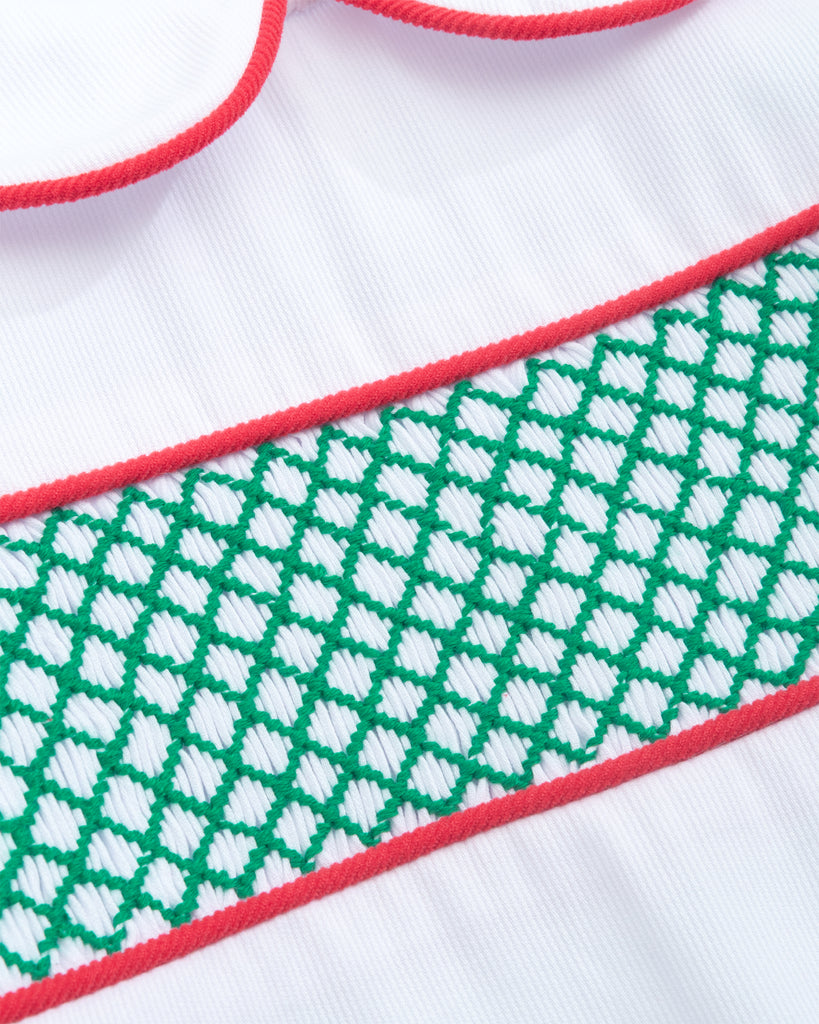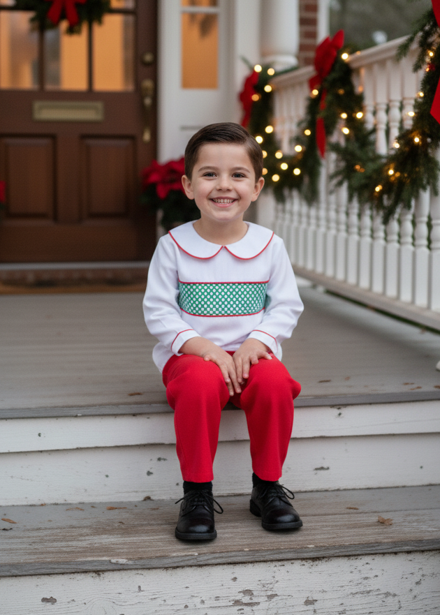 This refined boys' set features a smocked piqué shirt accented with subtle green piping and a classic Peter Pan collar, paired with rich red corduroy pants. Designed for stylish comfort, it offers a timeless look perfect for special occasions and festive gatherings.