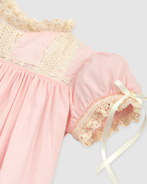 This Bristol Pink Heirloom Dress is exquisitely handcrafted with short puff elasticized sleeves, intricate lace and ribbon detailing, and classic buttons at the back neck.
