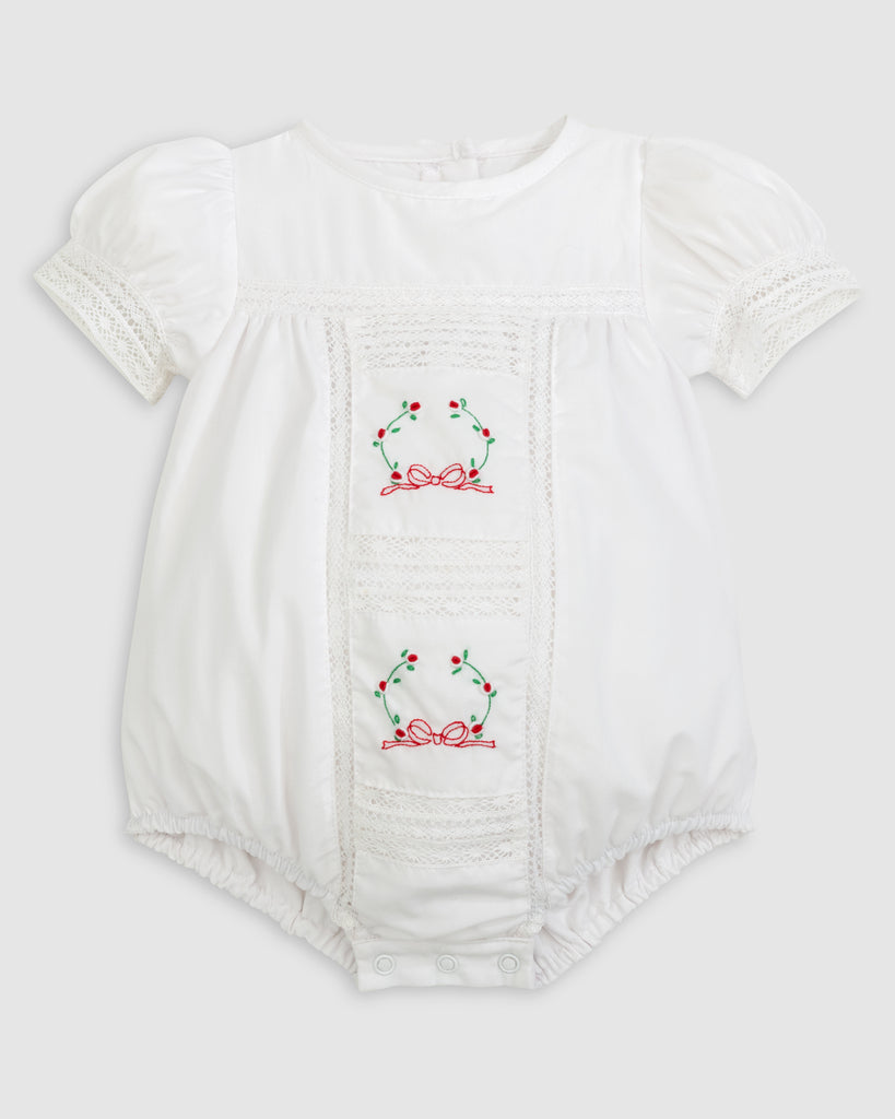 Elevate your holiday celebrations with the Pemberley Holiday Christmas Hand Embroidered White Heirloom Bubble. Crafted from soft white cotton, this exquisite piece features delicate hand-embroidered wreaths adorned with bows and bordered by intricate inset crochet lace trim. Fully lined for comfort, it offers elegant buttons at the back neck and convenient snaps at the crotch, blending timeless charm with practical design for your little one’s special Christmas moments.