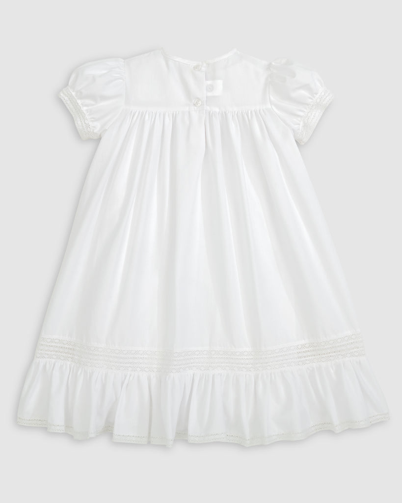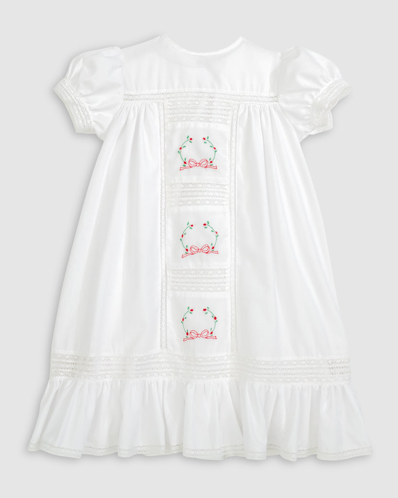 This exquisite Pemberley Holiday Christmas dress showcases delicate hand-embroidered wreaths accented with elegant bows, perfect for a refined holiday celebration. Crafted with heirloom-quality white fabric, it features intricate crochet lace inset trim and buttons at the back for a classic finish. The dress includes a lace-trimmed slip, ensuring comfort and grace in every detail. An ideal choice for cherished holiday portraits and special occasions.