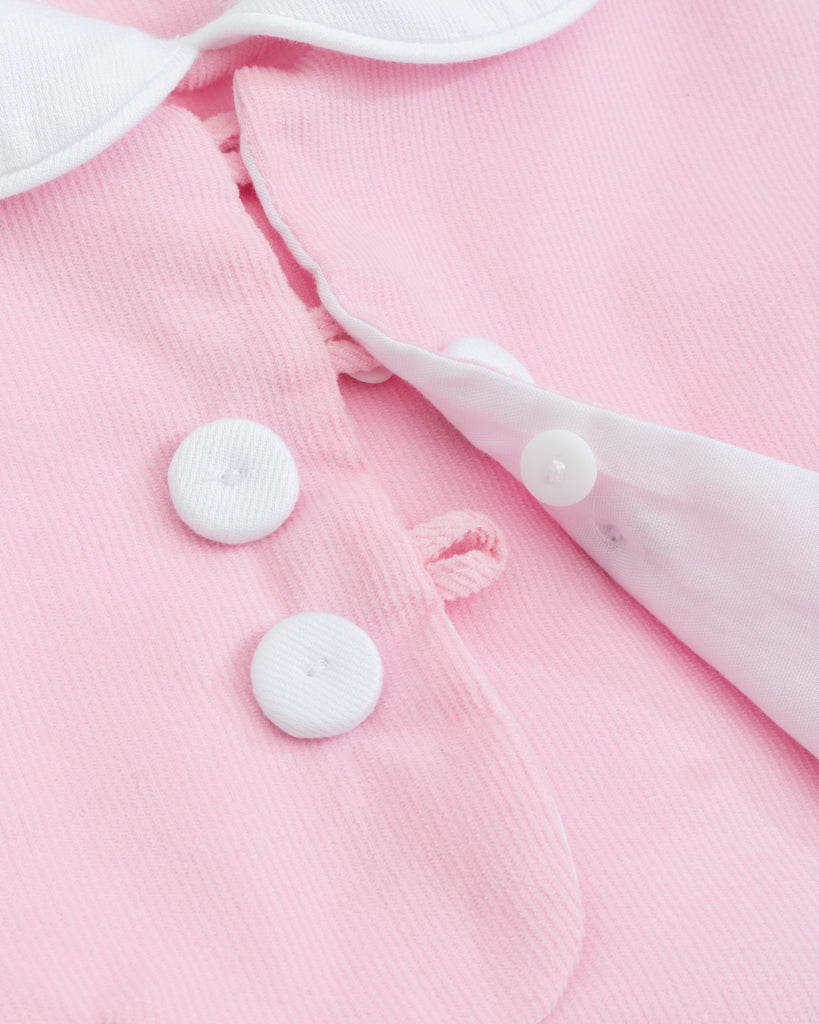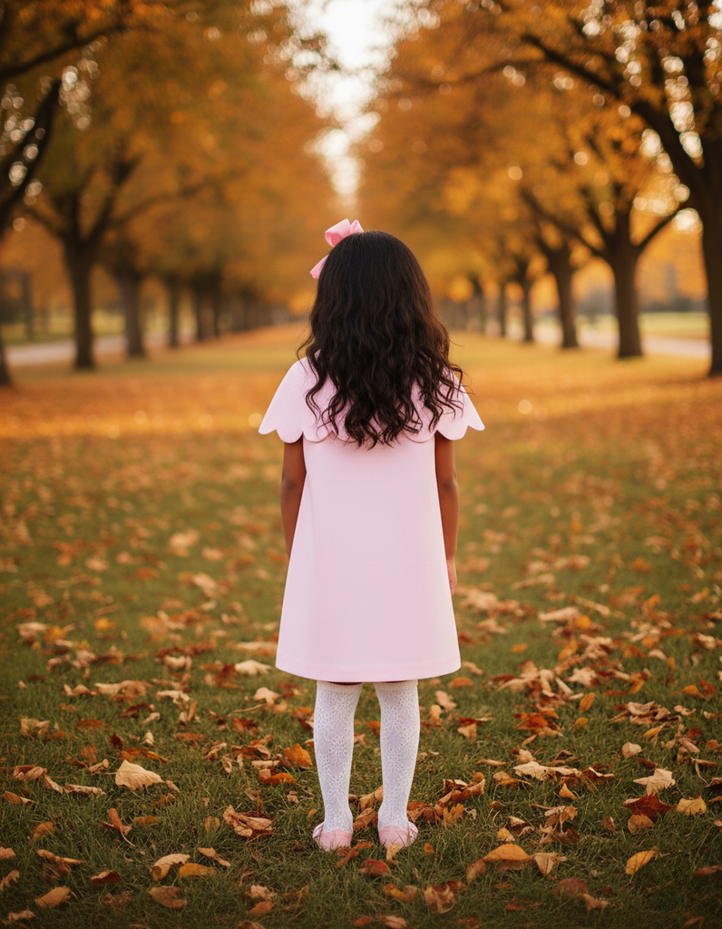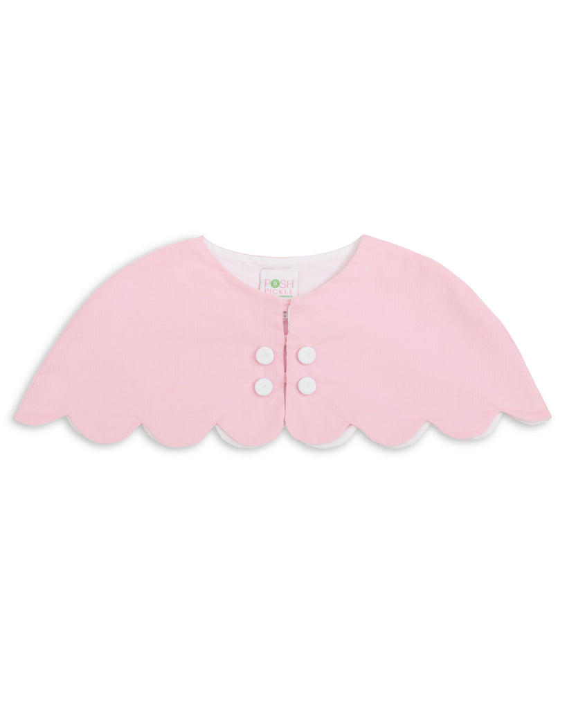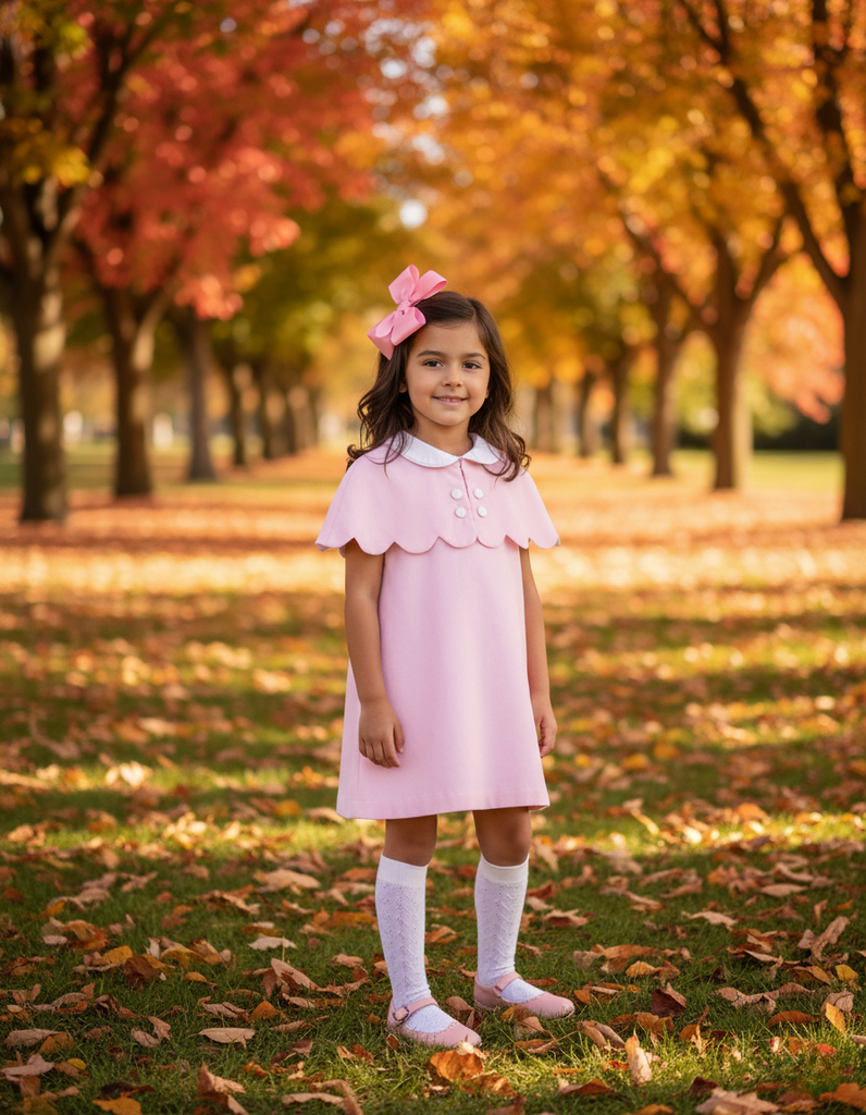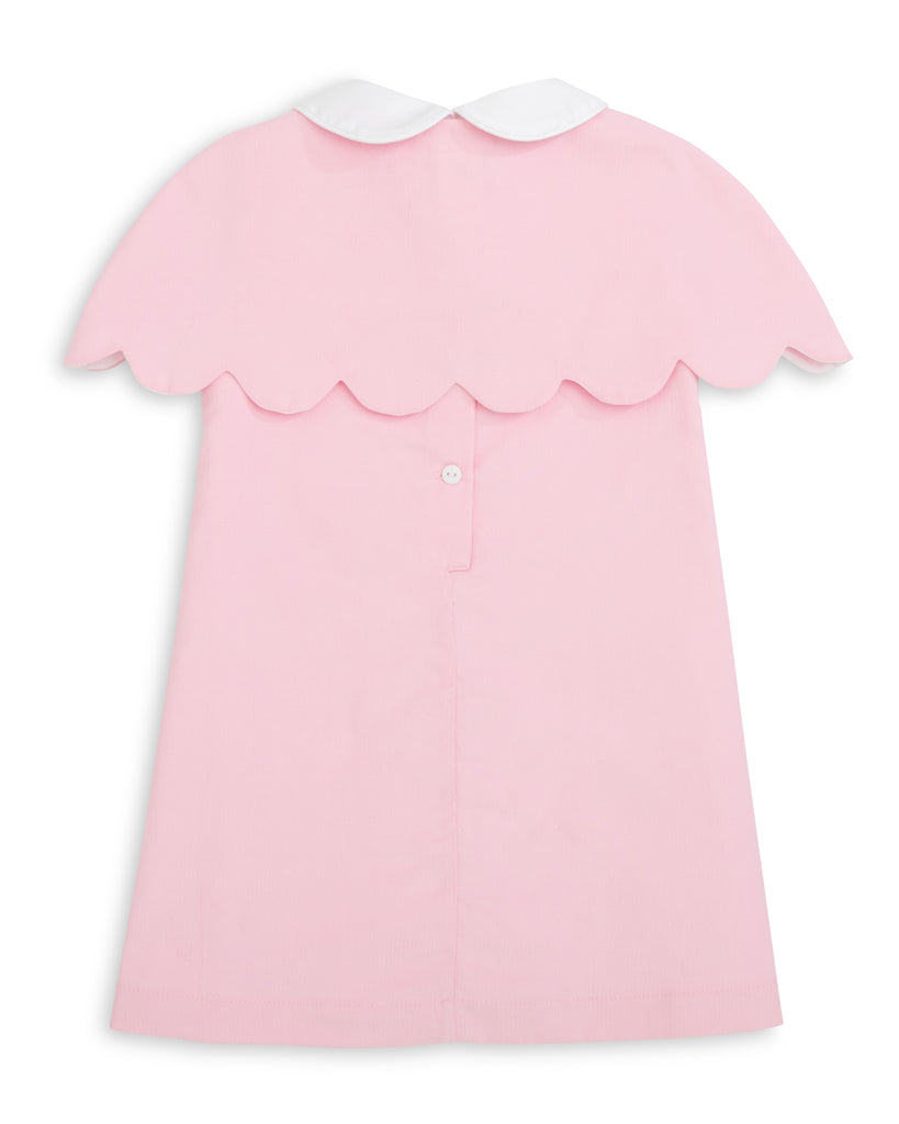Step into Spring with the playful charm of the Capelet Dress in Miriam, made from soft pink lightweight pinwale corduroy. This vintage-inspired A-line dress features a sweet Peter Pan collar and a fully lined silhouette for comfort. The detachable scallop-edged cape, adorned with decorative fabric buttons and a hidden closure, adds a whimsical touch perfect for photos, church, or Easter celebrations. Embrace fresh, whimsical style that’s as fun as it is timeless. Available for preorder now!
