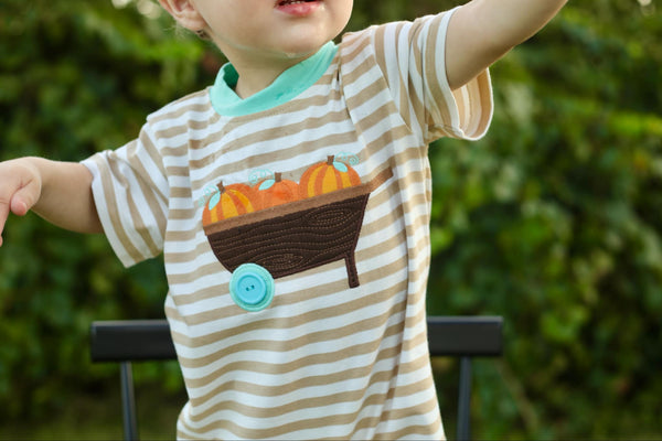 Pumpkin Harvest Boys' Tan Stripe Knit Romper with Pumpkin Wheelbarrow Applique