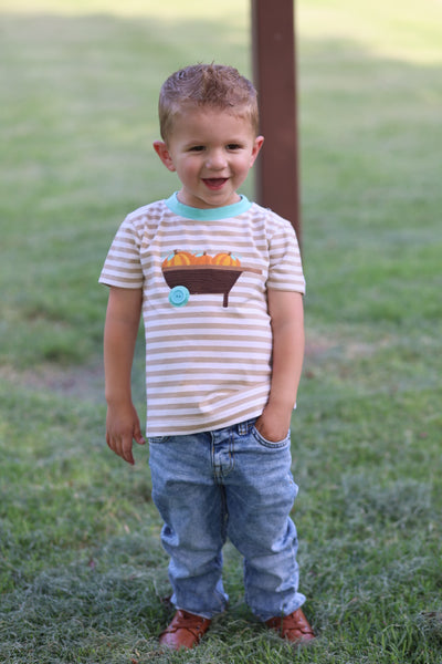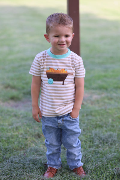 Pumpkin Harvest Boys' Tan Stripe Knit Shirt with Pumpkin Wheelbarrow Applique