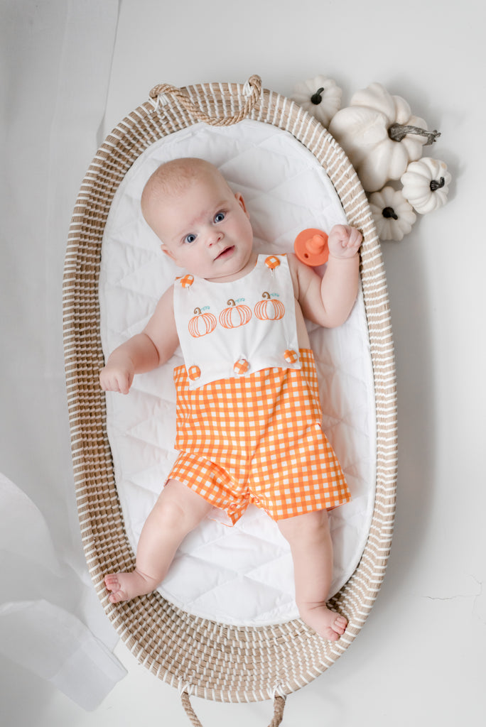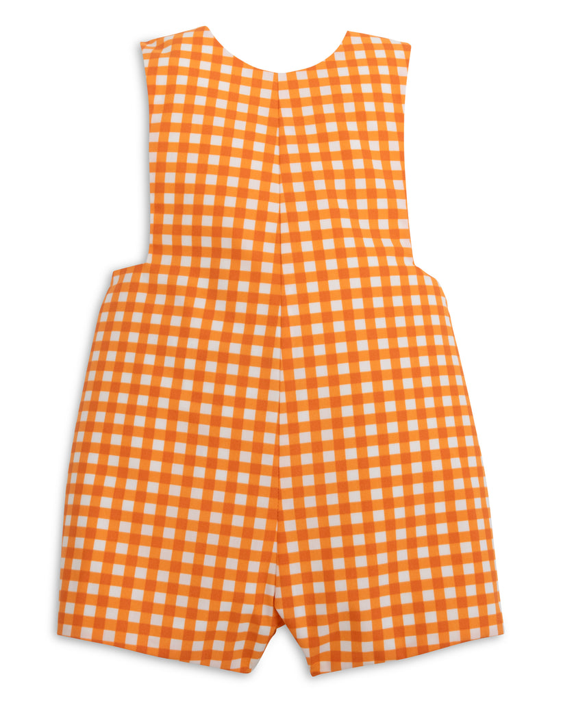 The pumpkin patch jon jon is made of orange and white gingham and is fully lined. Gripper snap closures at the crotch for easy diaper changes. The white bodice has three embroidered pumpkins. Buttons over shoulders and at front waist.
