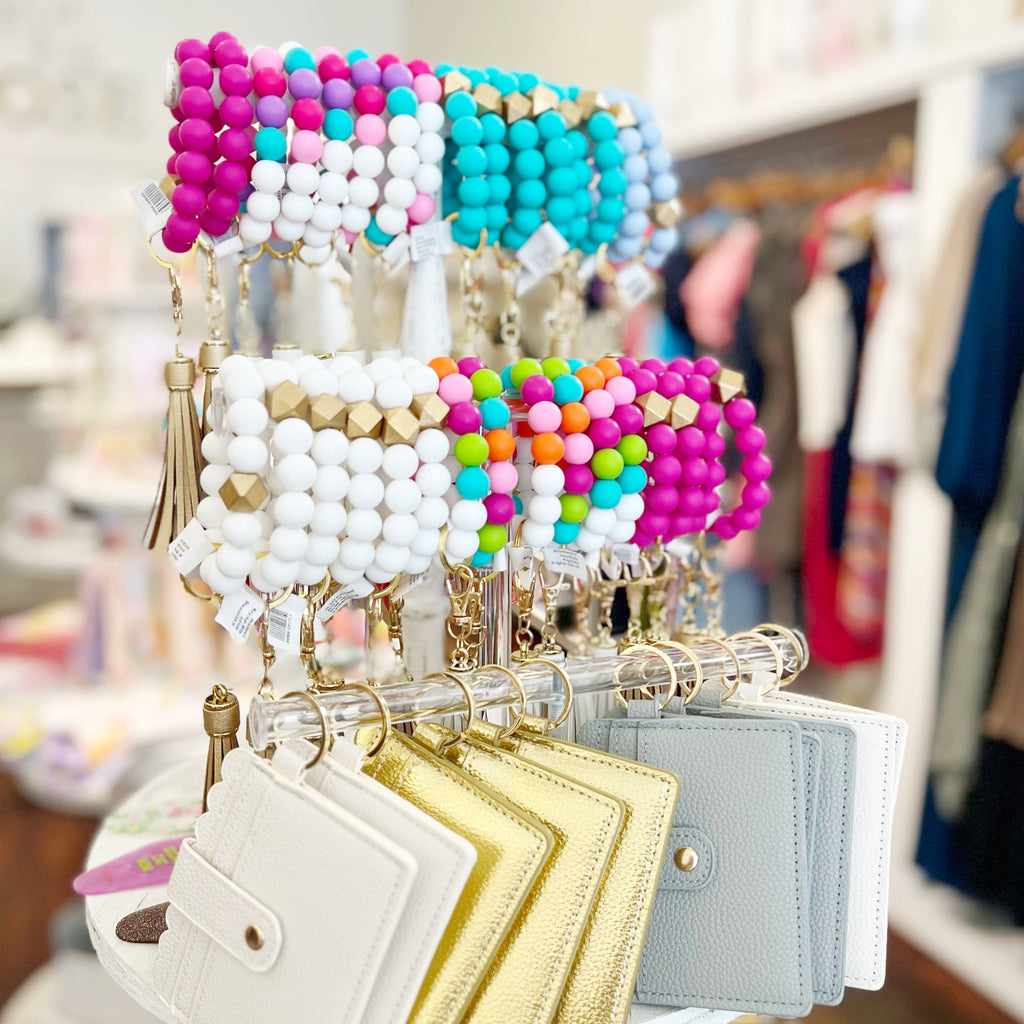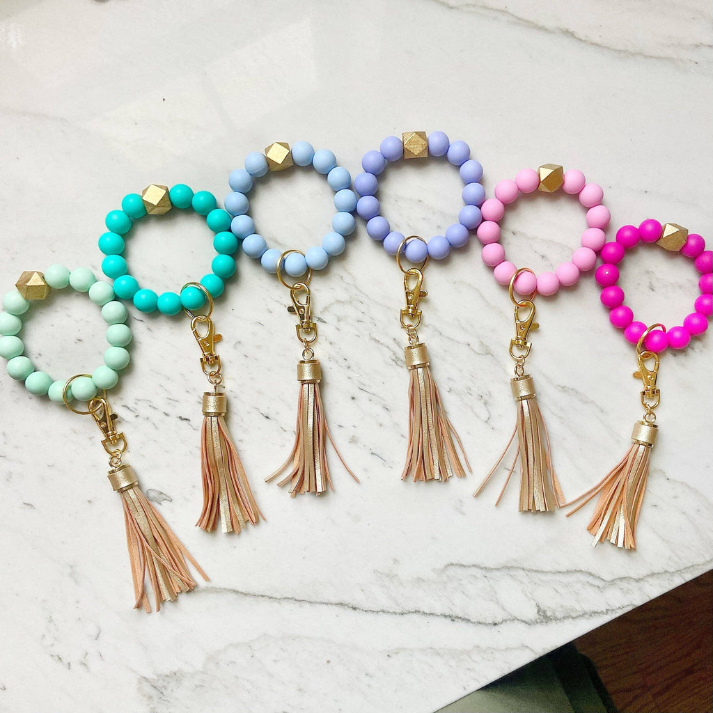 This wristband keyring is made with silicone beads, split ring, clasp, and leather tassel. The wristband keychain makes it easy for you to have your keys and wallet attached to your wristband, which easily slides onto your wrist!